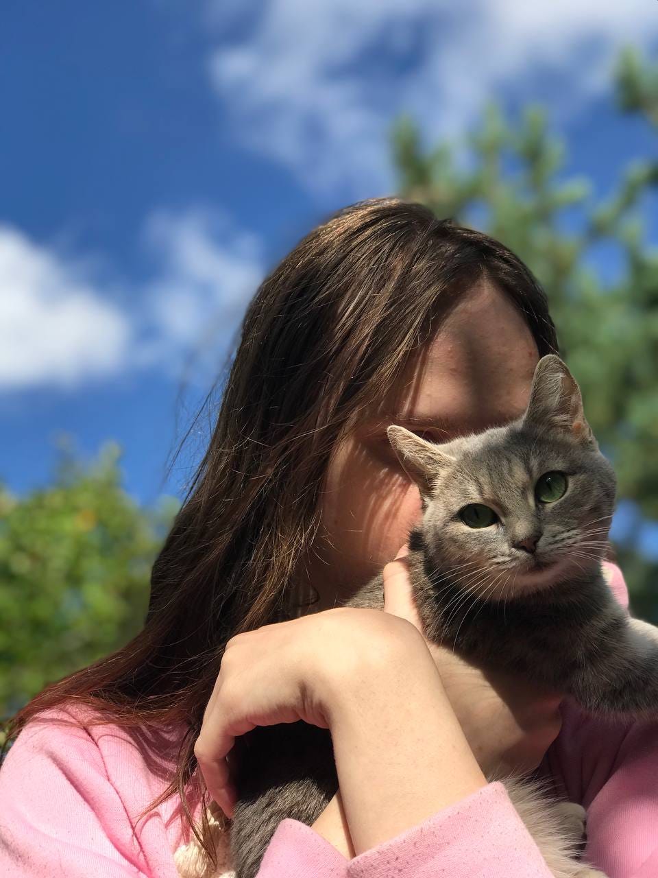 Черненькую зовут Эми, а серенькую Рей. Кошки — пожалуй, самые близкие мне существа. Не раз были причиной отказа от попыток суицида. Однажды я резалась, и вдруг Рей подошла, положила лапу на рукоять ножа и стала пристально смотреть мне в глаза. Я расплакалась и обняла её.